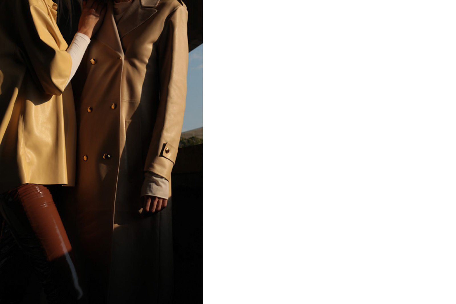 Trenchcoat von TIBI. Longsleeve von MARINE SERRE. Handschuhe von ROECKL.