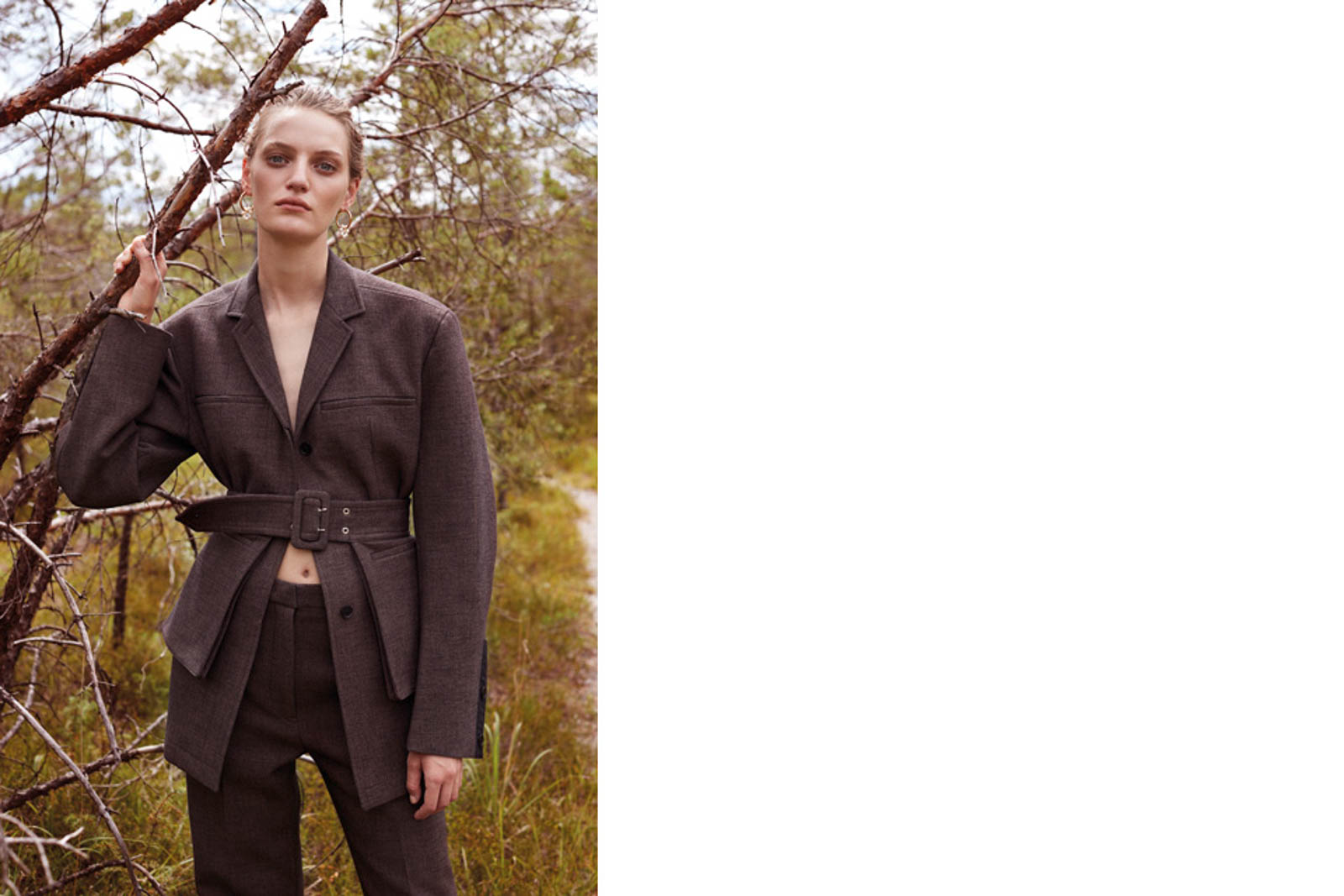 Blazer, Hose und Gürtel mit Taschen von JIL SANDER. Ohrringe von NINA KASTENS.