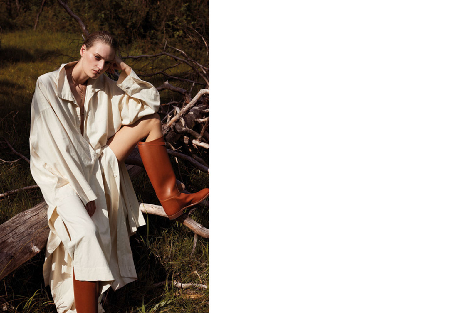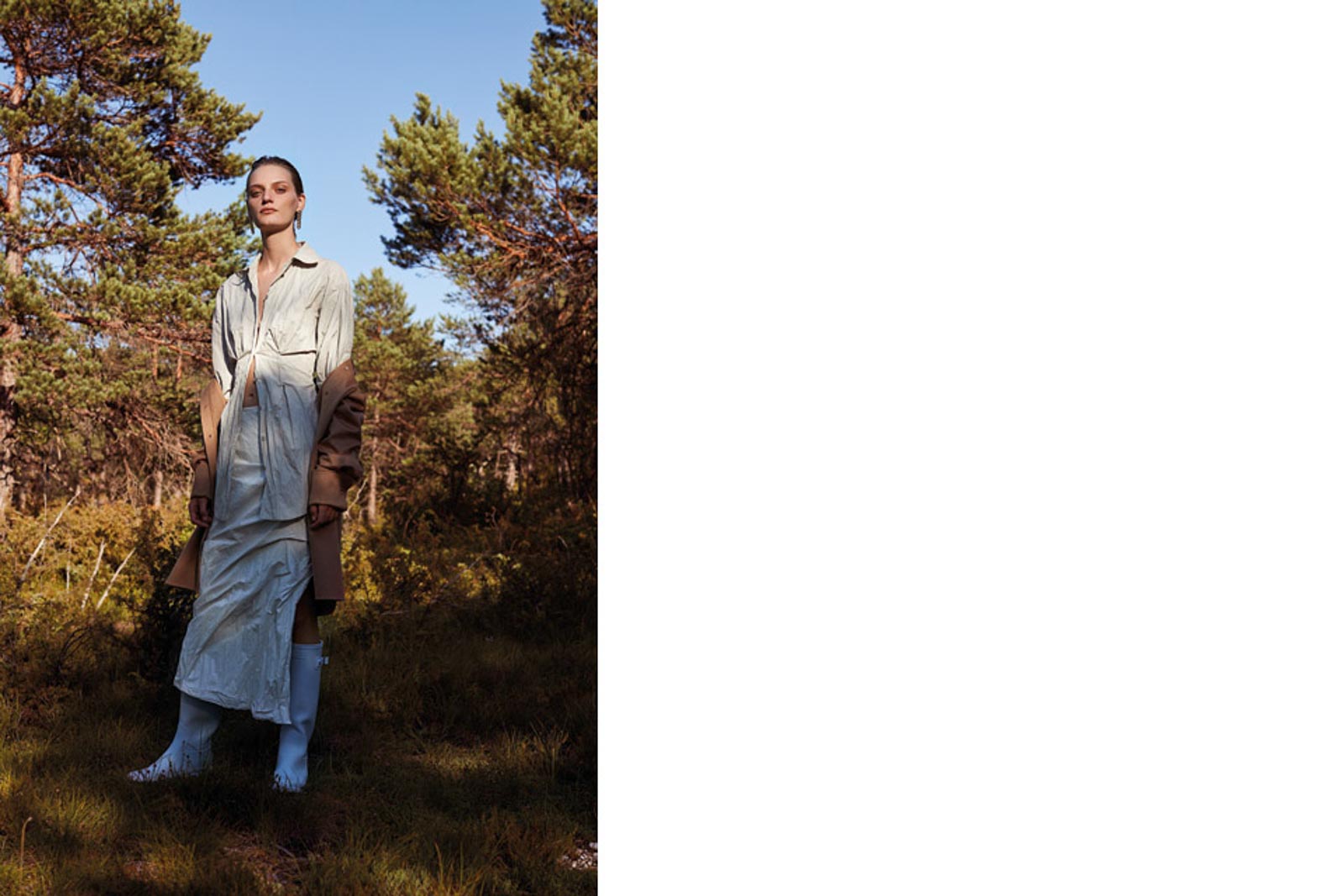 Bluse und Rock von ACNE STUDIOS. Hemd von MAX MARA. Gummistiefel von HUNTER. Ohrringe von SASKIA DIEZ.
