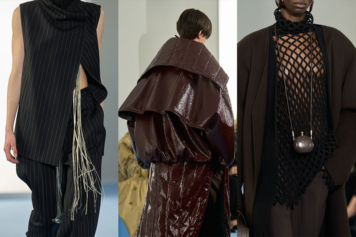 Die Kollektion stellt Outerwear klar ins Zentrum. Wärme entsteht durch skulpturale Konstruktion statt durch überflüssiges Volumen. Lange Duster-Coats und fliessende Woll-Wraps bewegen sich kontrolliert und ruhig, während hohe Funnel-Necks und integrierte Schal-Kragen das Gesicht rahmen. Lackierte Trenchcoats bringen Glanz ins Spiel, im Kontrast zu Leder-Bomberjacken in glatten oder Croco-geprägten Ausführungen. Gesteppte Texturen und Shearling-Details sorgen für Tiefe, ohne die klare Linie zu stören. Schutz entsteht hier durch Präzision.