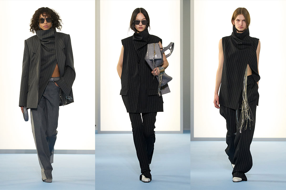 Anzüge bilden das Fundament. Dunkle Nadelstreifen ziehen sich durch ärmellose, verlängerte Blazer sowie schmal geschnittene Hosen und betonen die Linearität. Die Schultern sind strukturiert, aber nie übertrieben. Funnel-Neck-Elemente gehen nahtlos in die Jackets über und schaffen eine durchgehende Linie von Kragen bis Taille. Asymmetrische Wicklungen und metallische Fransen setzen Bewegung, während schmale Hosen mit subtilen Seiteneinsätzen das Bein optisch verlängern.