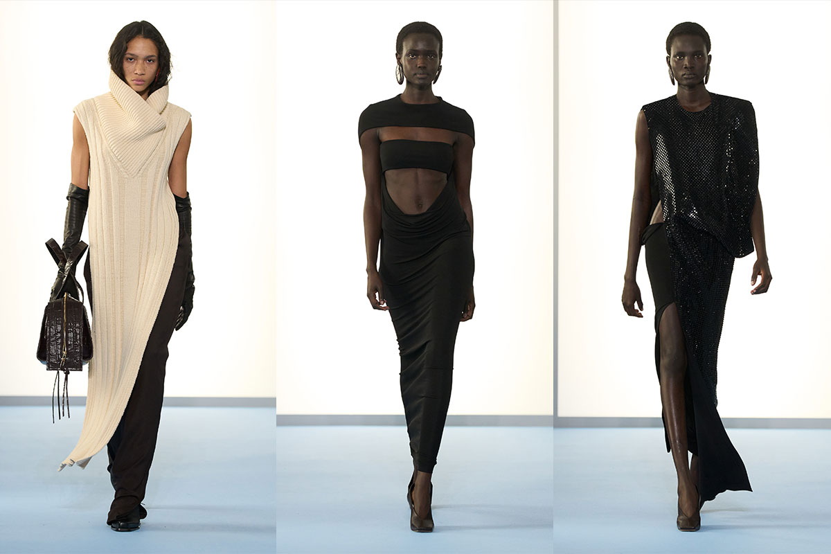 Unter den stärkeren Layern bleiben die Silhouetten schmal und gestreckt. Gerippte Strickkleider fallen asymmetrisch und formen den Körper zurückhaltend. Stretch-Jersey-Columns schmiegen sich an, während trägerlose schwarze Kleider und Cut-out-Designs gezielt Haut an Taille und Rippen freigeben. Auch für den Abend bleibt alles diszipliniert: Ein asymmetrisches, mit Pailletten besetztes Top zum High-Slit-Rock bringt Textur, ohne die vertikale Klarheit zu brechen.