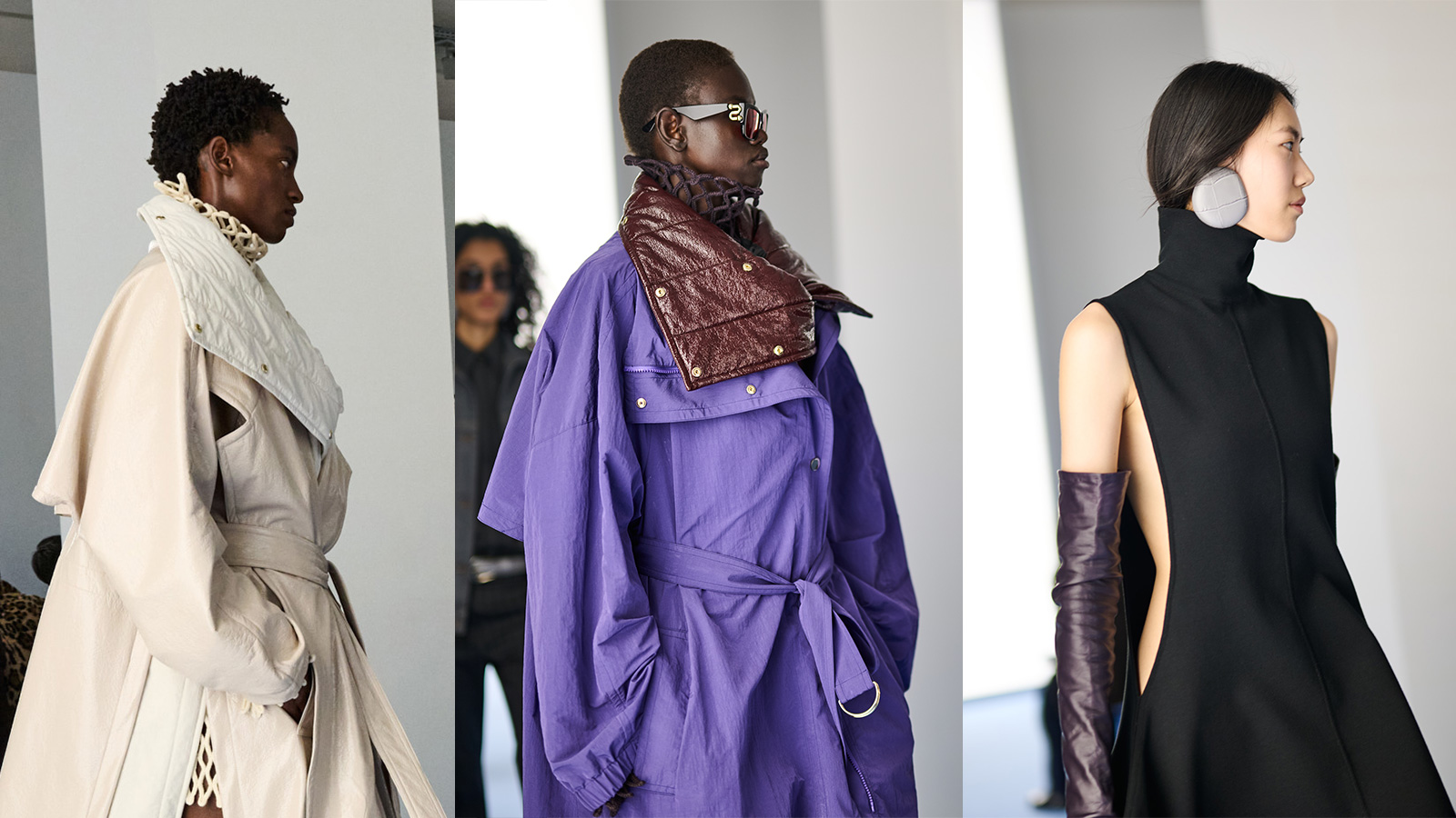 Die Kollektion stellt Outerwear klar ins Zentrum. Wärme entsteht durch skulpturale Konstruktion statt durch überflüssiges Volumen. Lange Duster-Coats und fliessende Woll-Wraps bewegen sich kontrolliert und ruhig, während hohe Funnel-Necks und integrierte Schal-Kragen das Gesicht rahmen. Lackierte Trenchcoats bringen Glanz ins Spiel, im Kontrast zu Leder-Bomberjacken in glatten oder Croco-geprägten Ausführungen. Gesteppte Texturen und Shearling-Details sorgen für Tiefe, ohne die klare Linie zu stören. Schutz entsteht hier durch Präzision.